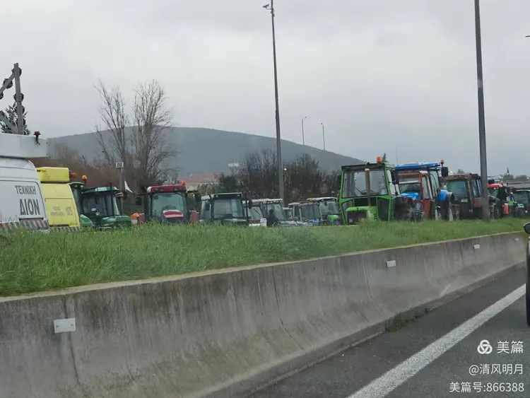 我们原计划用8个小时作为来回行程的代价,结果遇到希腊农民抗议活动,用拖拉机将高速公路截断,司机在高速和小路之间穿梭,用了整整11个小时才打了个来回。问过司机才知道,希腊农民堵高速,是因为政府承诺兑现慢、补贴没到位、成本太高、收入太低。在欧洲,农民抗议常用拖拉机封路,希腊、法国、西班牙、德国农民都常用这种方式抗议,真是长见识啦。