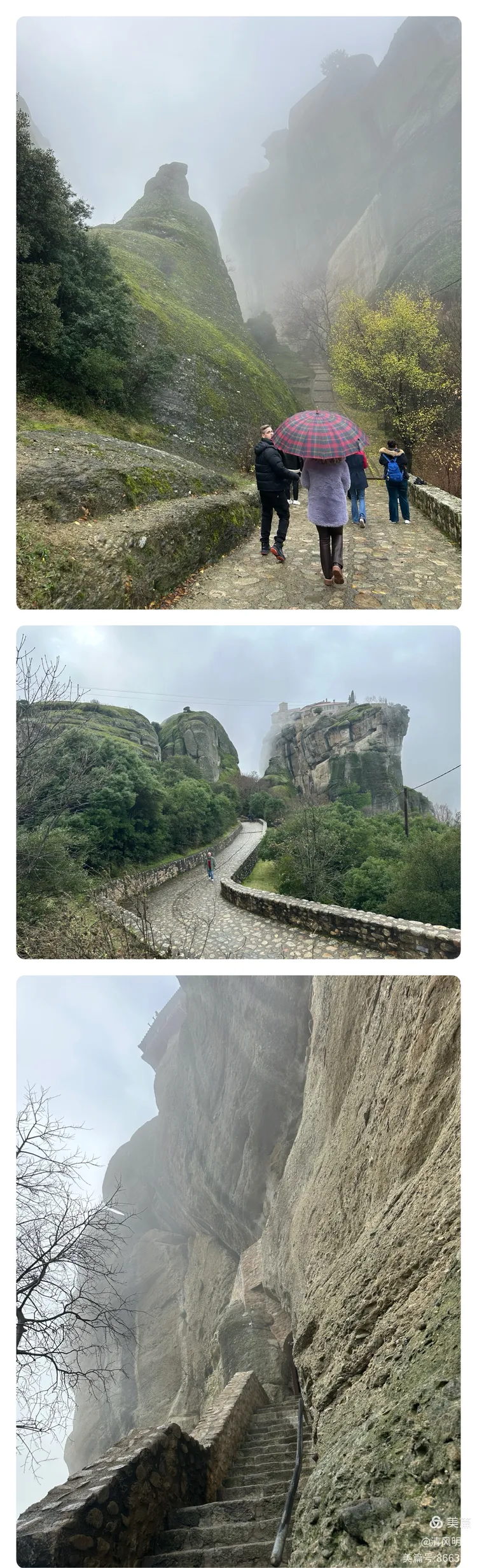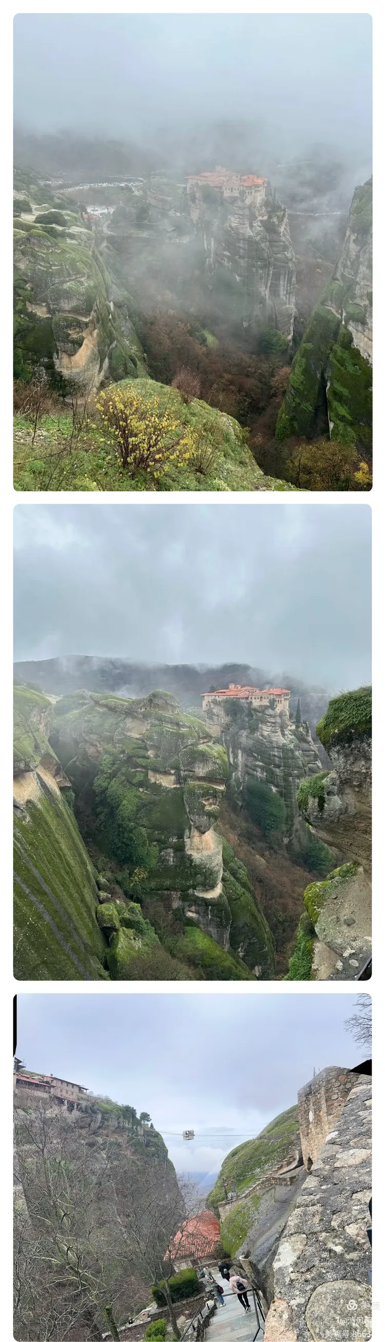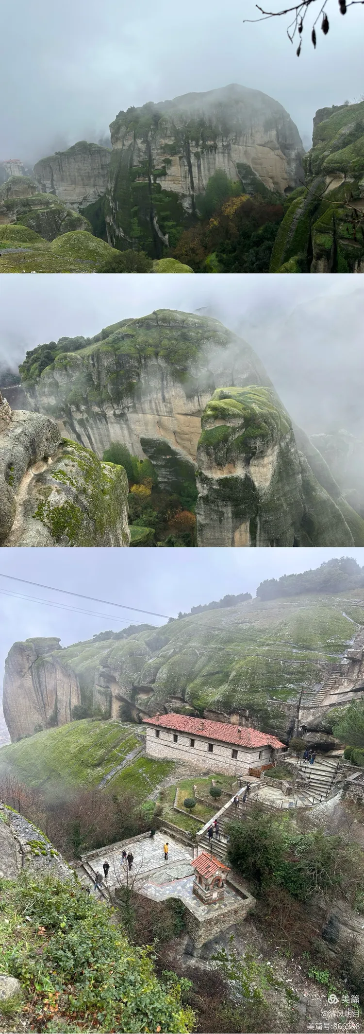 非常幸运的是,在我们返程前登上观景台时,老天赏景而放晴,让我们看到巨石如石林般拔地而起的全景。峭壁直指云端,修道院仿佛嵌在岩壁上,从砂岩之巅静静俯瞰天地,如天际守望者般伫立在日光之中、守护着这片古老而神圣的奇境。不枉我们从雅典往返11小时的奔波,值了。