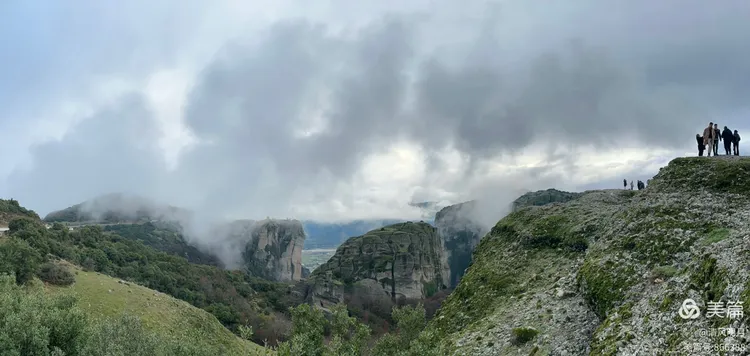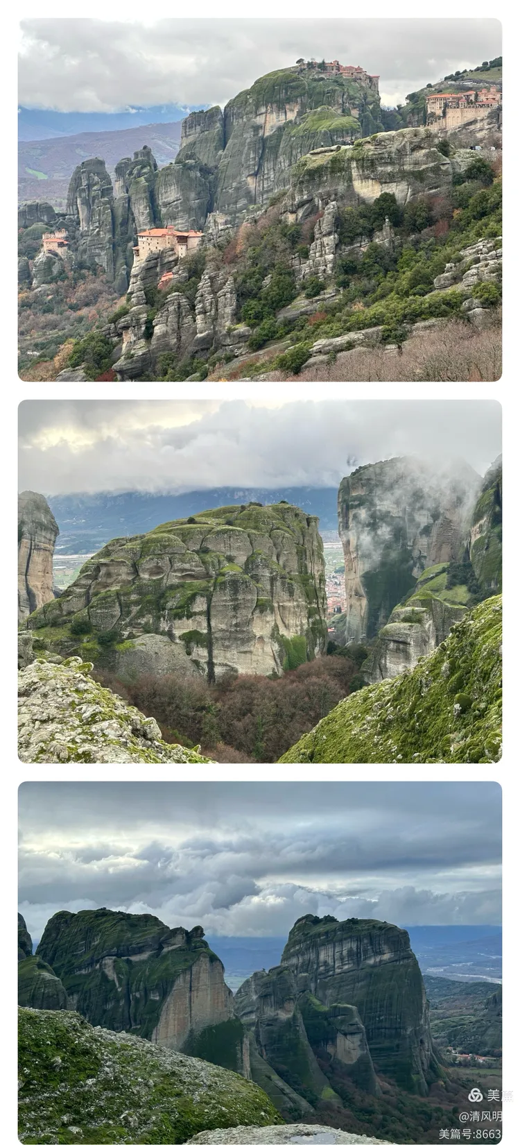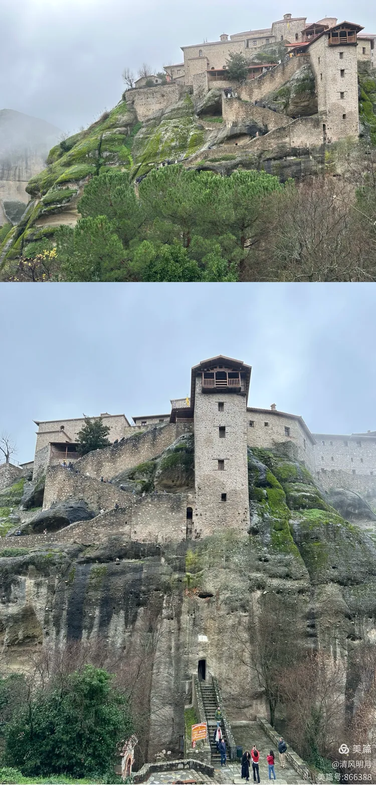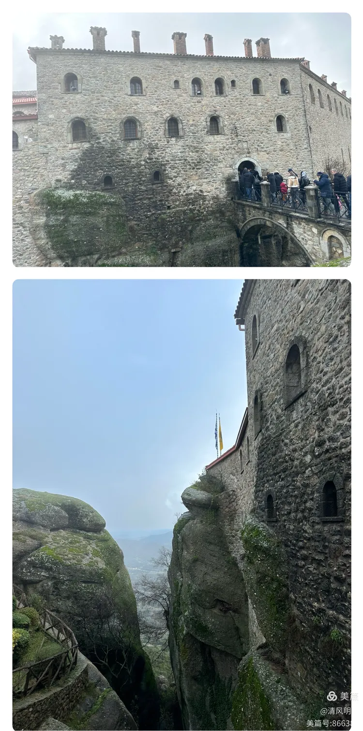 非常幸运的是,在我们返程前登上观景台时,老天赏景而放晴,让我们看到巨石如石林般拔地而起的全景。峭壁直指云端,修道院仿佛嵌在岩壁上,从砂岩之巅静静俯瞰天地,如天际守望者般伫立在日光之中、守护着这片古老而神圣的奇境。不枉我们从雅典往返11小时的奔波,值了。