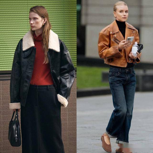 暖橘色的短皮夹克,利落干净的线条,搭配牛仔阔腿裤来穿,显高显瘦,又透着爽利感,搭配黑色的修身高领针织衫,外套的硬朗被毛衣的温柔化解,配色又温暖高级,很适合初冬。