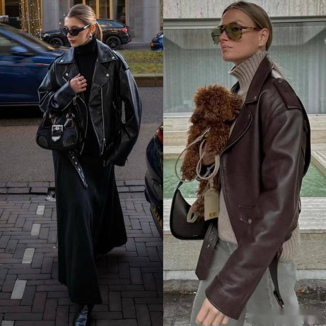 黑色皮夹克叠穿黑色高领毛衣,搭配黑色长裙,一身黑的穿搭,显瘦显高,又透着精致与高级感,酷酷的又很有女人味。