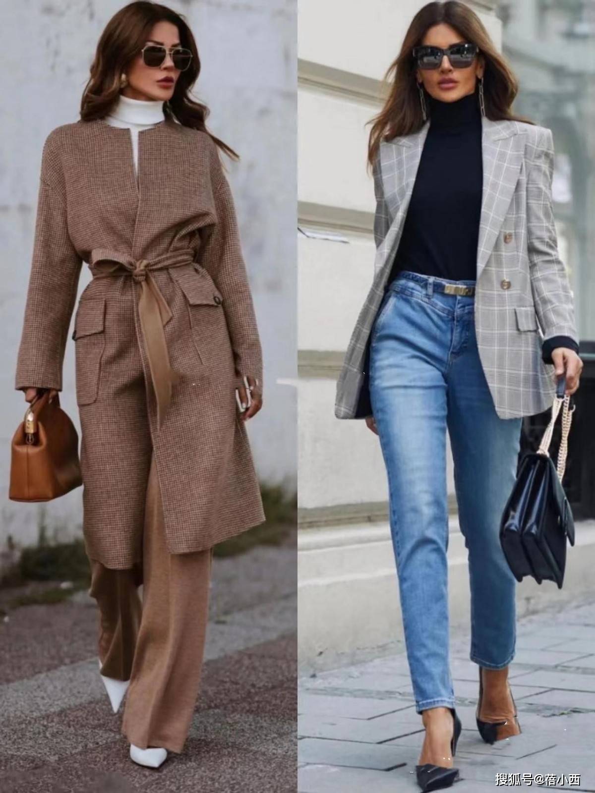 比如这种经典的棕色和黑色搭配,结合蓝色牛仔裤,简单利落,整体都是非常低调沉稳的深色系,组合起来非常显瘦,避免了搭配的花哨感,适合成熟女性的气质。