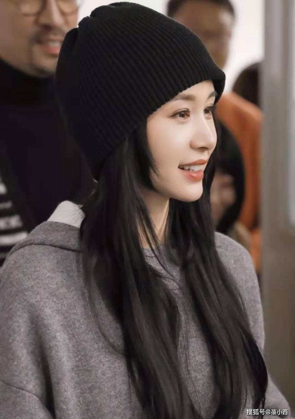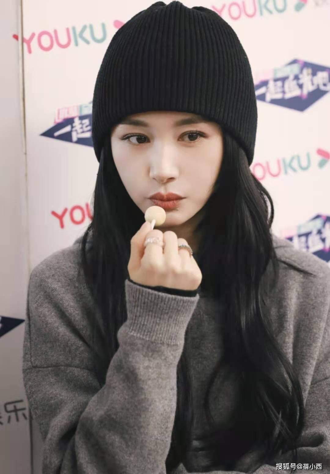 头上的针织帽是纯黑色面料,此色可驾驭各种场合,而且在搭配衣服上挺省人。冬天戴针织帽的时候,怕耳朵冷可将帽子边缘的面料往下拉一点。平日戴针织帽时,见的最多的发型就是披发、低马尾,这两个发型都不费时。