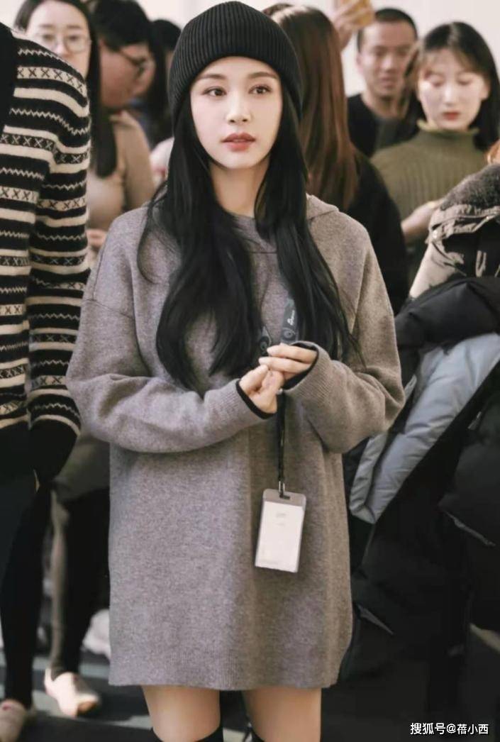 通过观察,上半身极有可能穿了三件。领口、衣摆处都能看到白色面料。灰色卫衣夹在中间,就是无法看出里层是否加绒。灰色卫衣依旧具有百搭特点,短款设计最为流行,毕竟人人都想拥有大长腿。腿上裤子依旧是灰色面料,大腿处松量看着挺多,那么大腿根就算有肉肉,也不会被看到。
