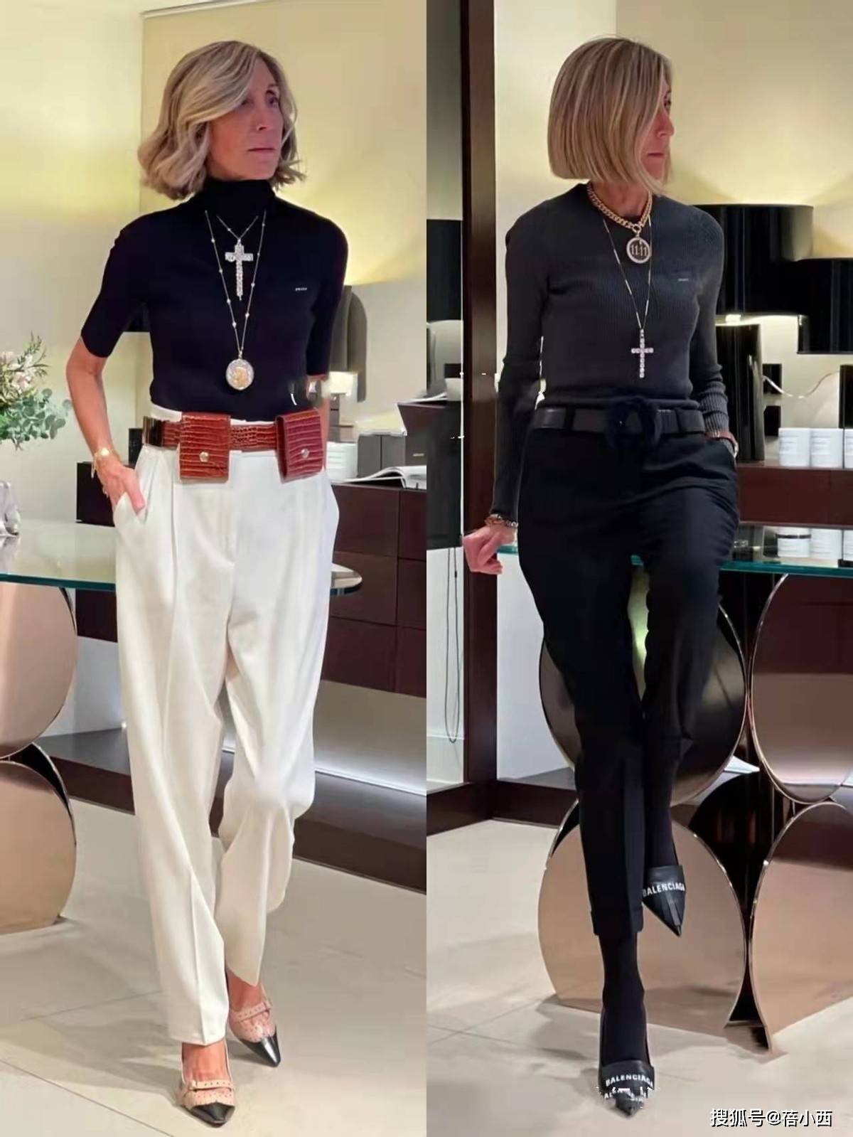 质感好是这个博主穿搭中最值得学习的一点,她深知,到了这个年纪,面料的好坏一眼便知。因此,她宁愿少买几件,也要投资一些面料上乘的单品:一件羊绒衫的软糯亲肤,一条真丝衬衫流露的光泽感,一件羊毛西装外套拥有挺括的筋骨。这些优质面料自带高级属性,即使设计简单,也能让穿着者散发出“这衣服不便宜”的含蓄贵气,气质出众。