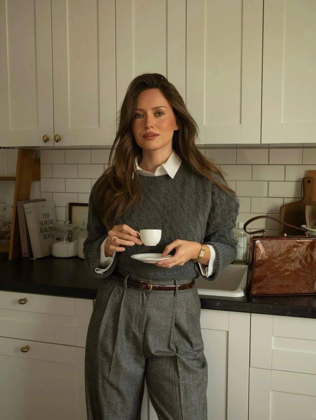 灰色绞花:自信优雅,搭配西装阔腿裤与咖色腰带,大气从容,演绎知性休闲气场。