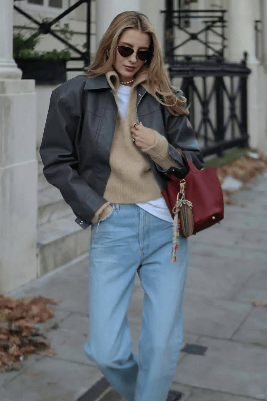 搭配建议: 外搭黑色皮衣,内叠卡其色Polo领毛衣与蓝色牛仔裤,率性休闲中流露高级感。