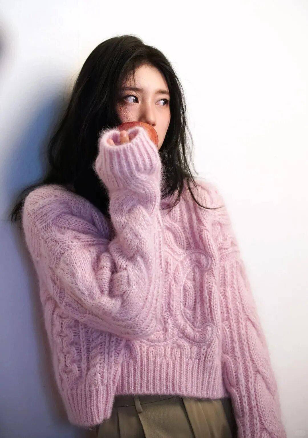 粉色绞花:温柔显智慧,配卡其色西装阔腿裤,营造松弛时尚感,自信展露独立气质。