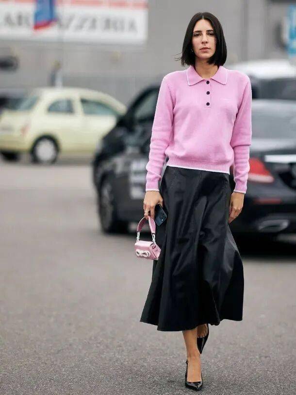 粉色Polo领:青春活力,配黑色半裙与高跟鞋,简约中蕴含态度与自信魅力。