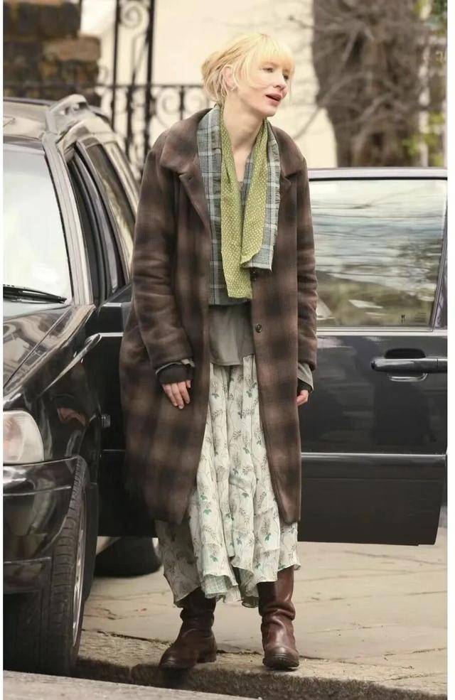 或者搭配一条材质轻盈的浅色系碎花长裙,配上棕色的靴子,加一条浅绿色的格纹围巾点缀,便成就了一身温柔浪漫、优雅复古的冬日造型。