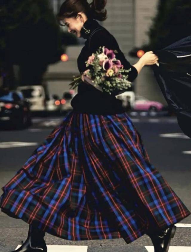 也可以选择色彩更浓郁的格子半裙,为冬日着装带来活力。选择宽阔的裙摆,带有一点隆重感,穿起来更灵动。