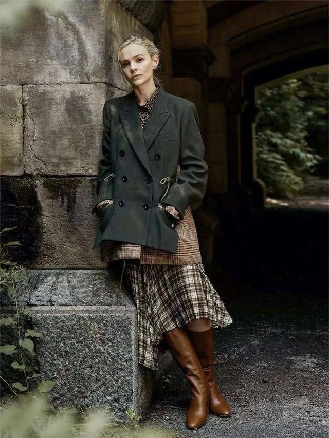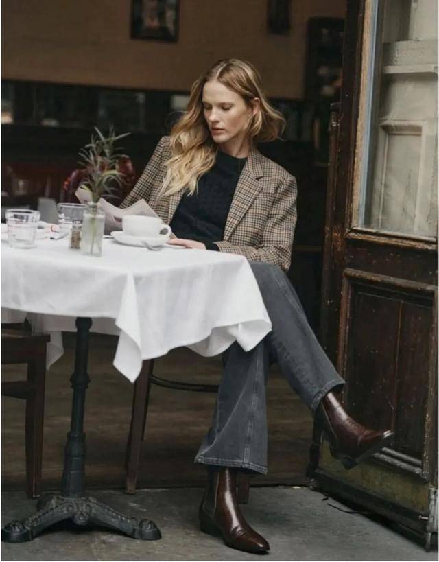 格子西装,是塑造复古造型的气质担当。细密的小格子加上质朴的色调,比纯色西装更有叙事感,搭配牛仔裤和短靴,显得没那么正式和严肃,整体风格复古又摩登,优雅又不失随性。