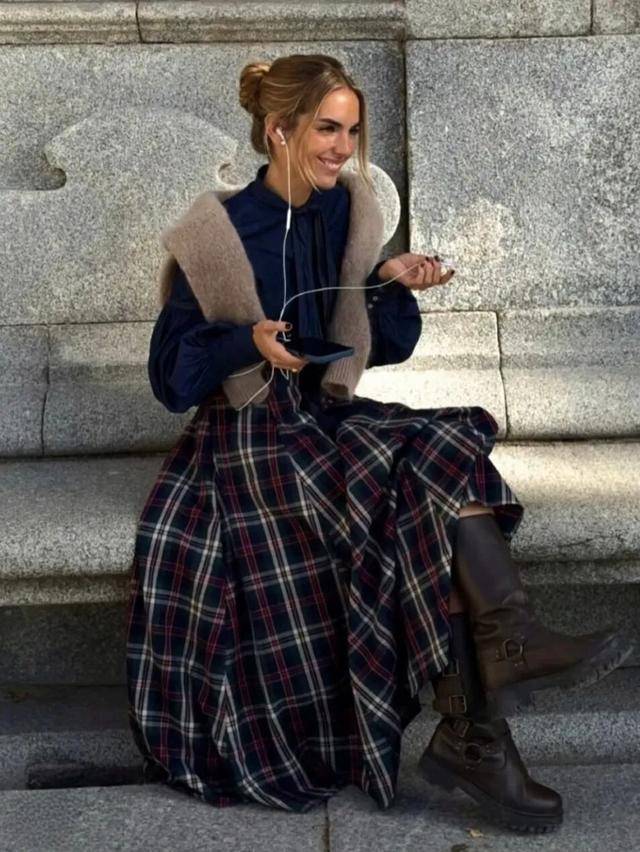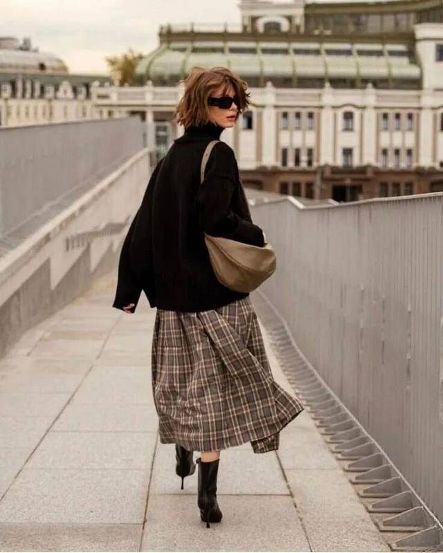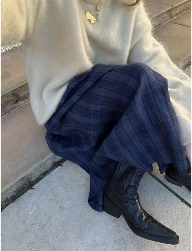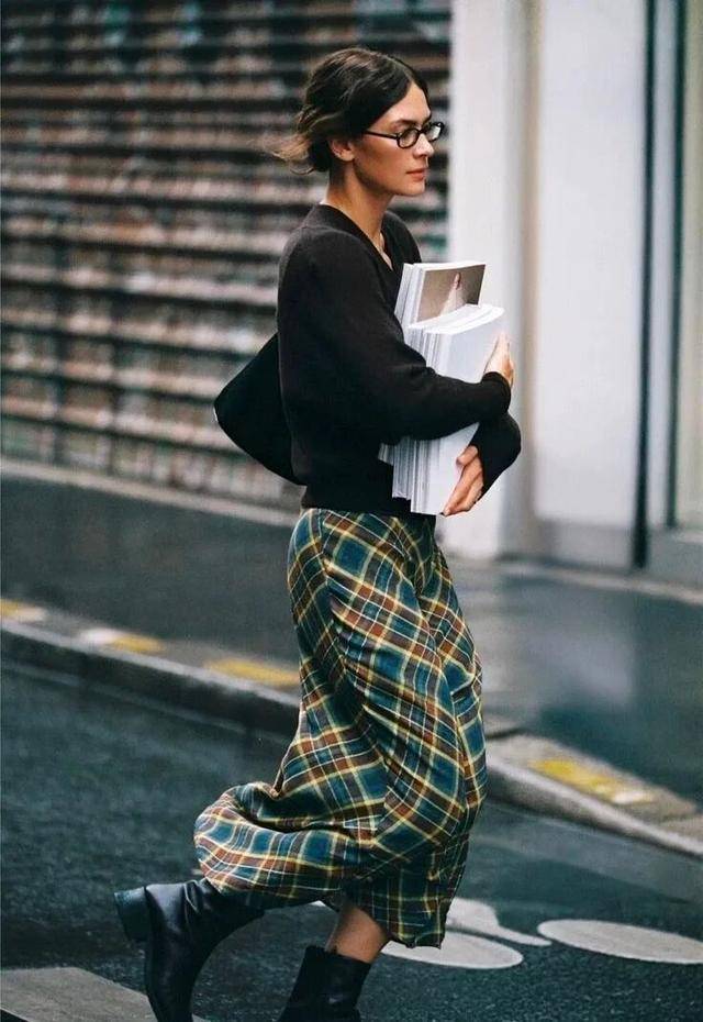 选择细密的威尔士亲王格,或者窗格纹的半身裙,色彩偏向棕、黑、驼的质朴雅致,穿起来更有高级感。上衣可以搭配复古双排扣西装或者黑色毛衣,动静皆宜,复古又摩登。
