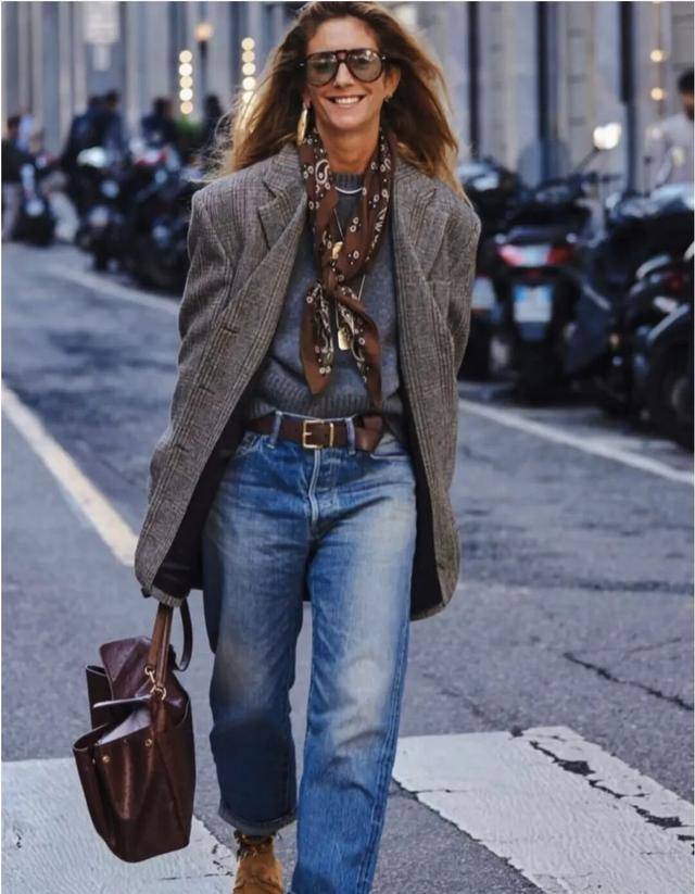 灰色格子西装内搭灰色毛衣,将下摆扎进牛仔裤腰,棕色腰带点明腰线,加一条棕系的印花丝巾来丰富细节,一身满满的复古风情,还能让你在通勤与休闲之间自由切换。