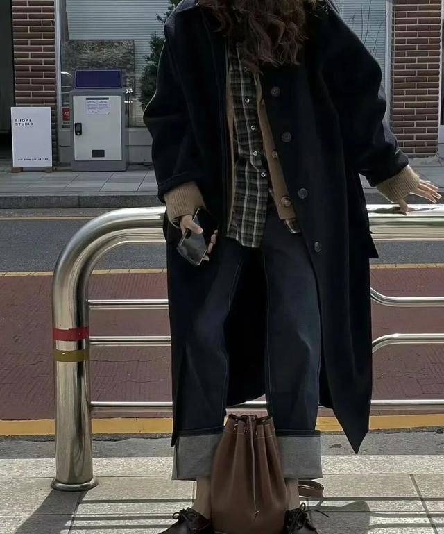 大衣的风格也偏正式,内搭加一件格子衬衫作为中间层,露出小面积的格纹,像是一个精心设计的小秘密,让整个造型瞬间变得生动有趣。