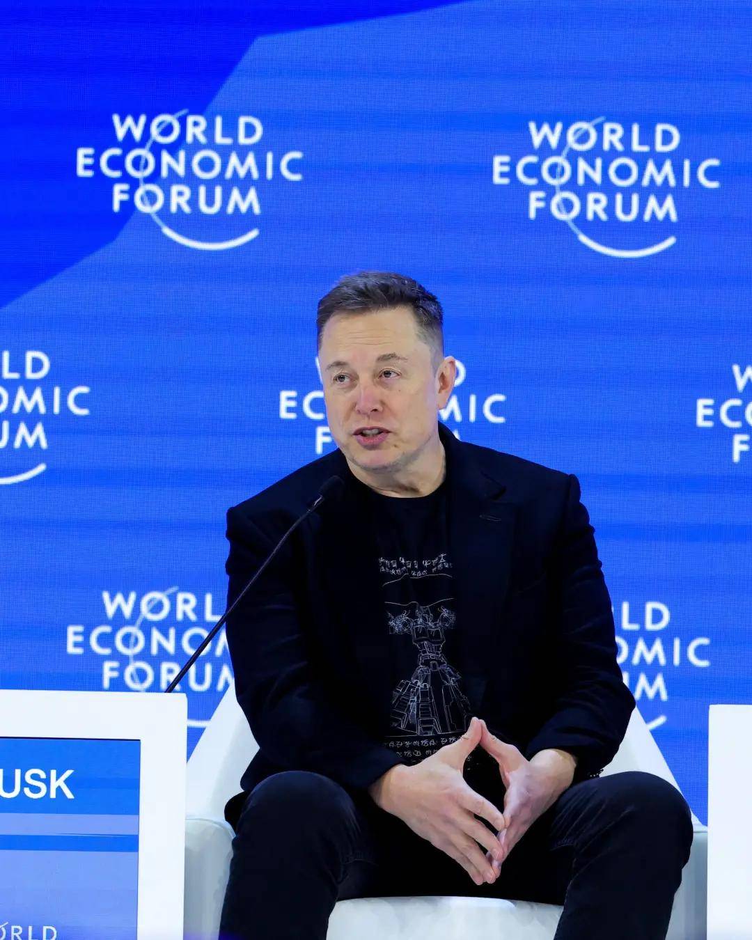 马斯克今年也现身达沃斯,全黑西装内搭摇滚T恤,大走暗黑风。