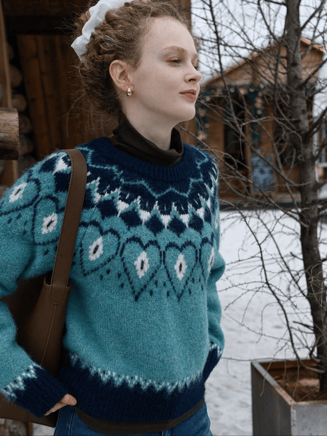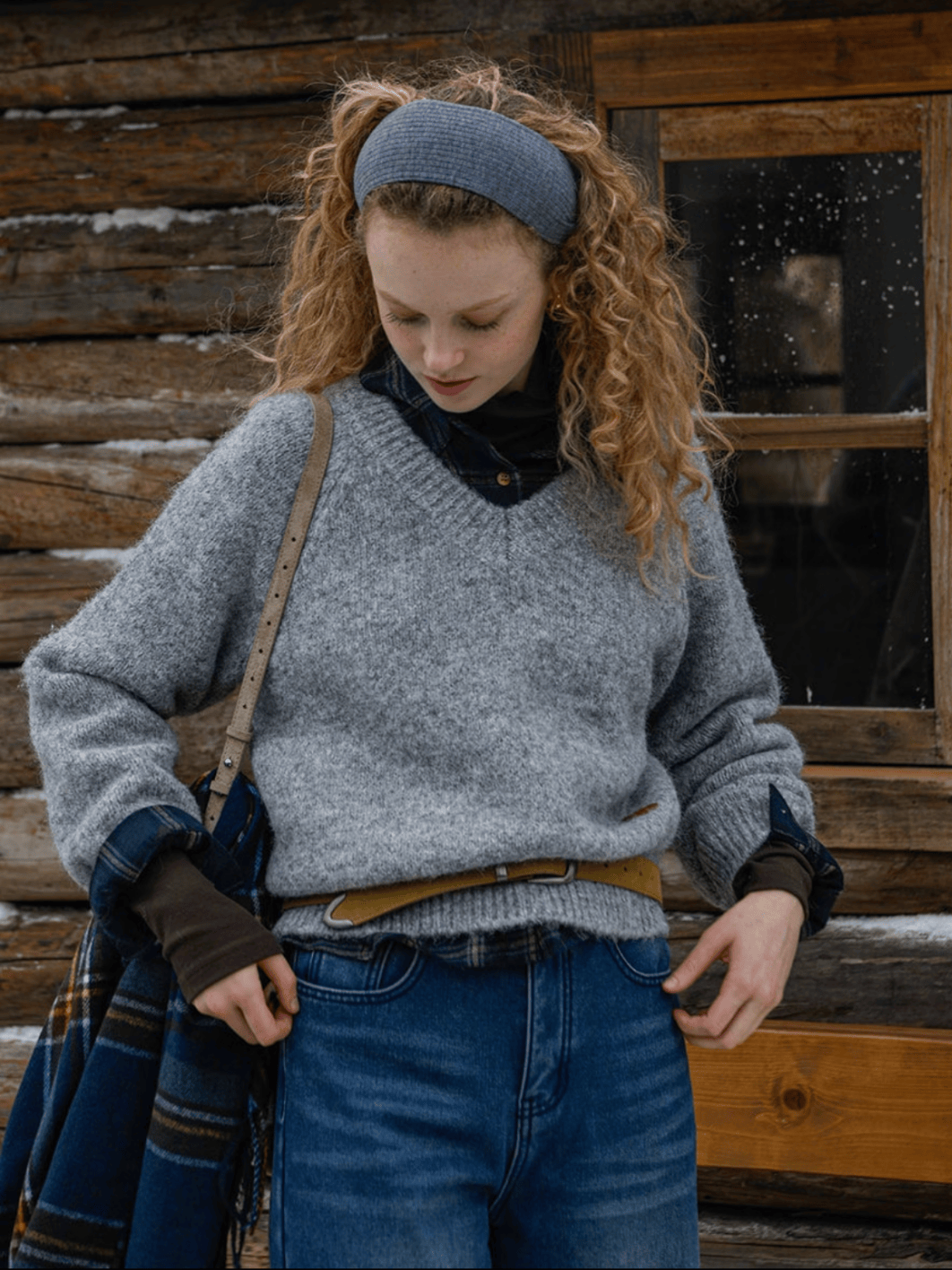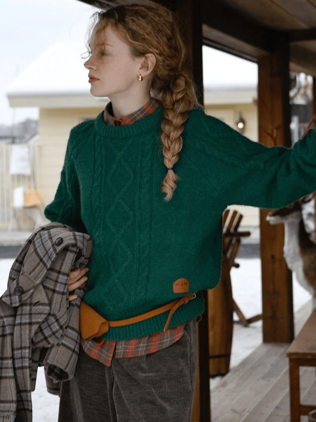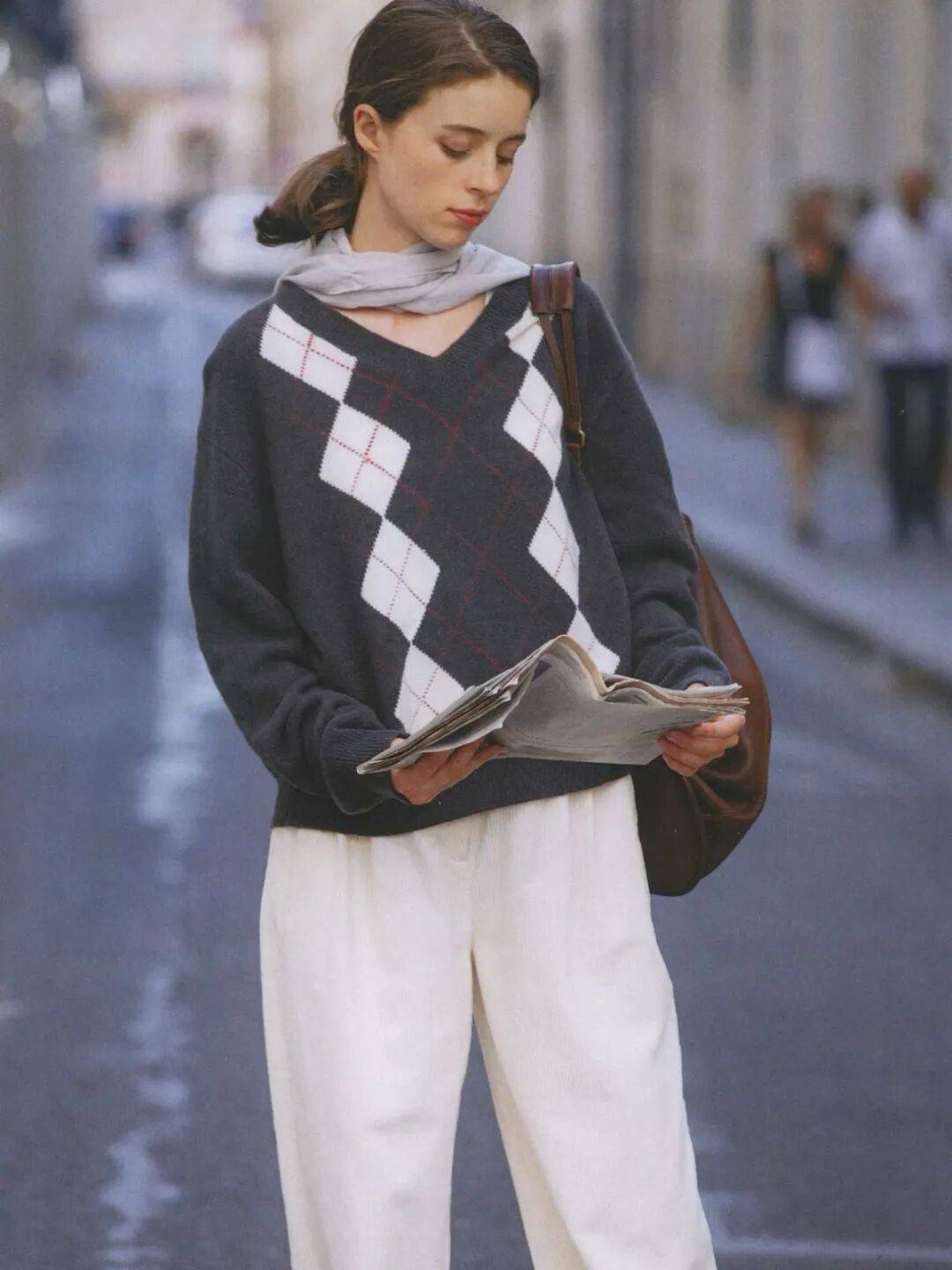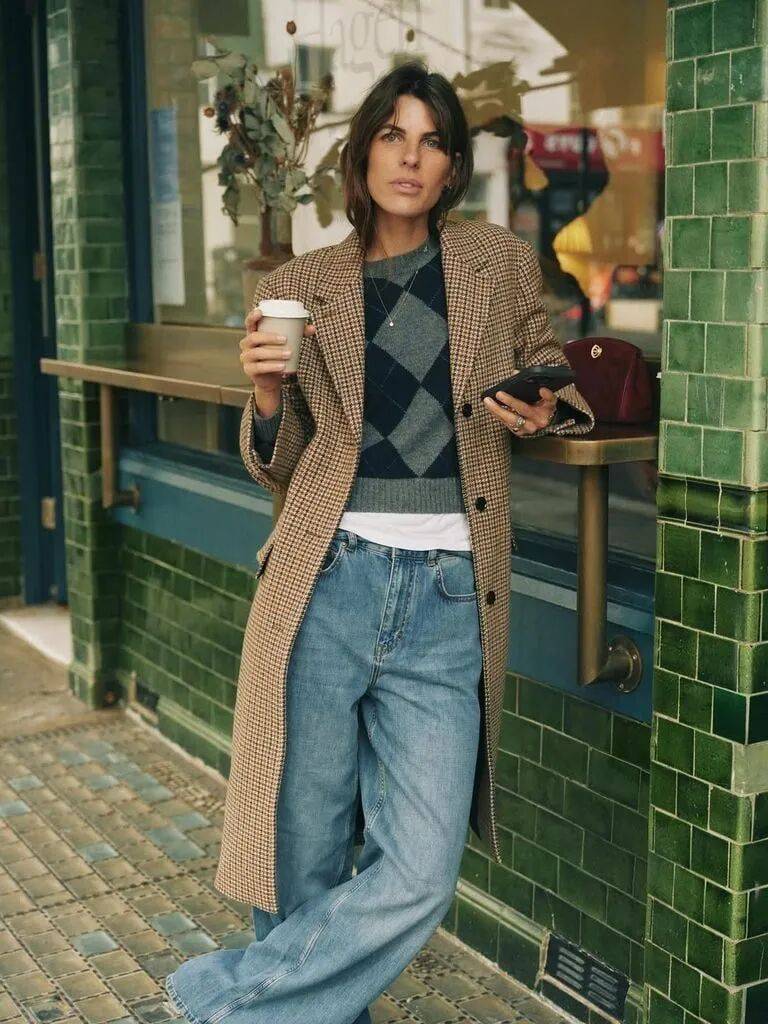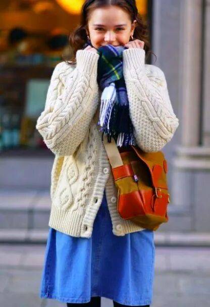 粗棒针的绞花毛衣,纹路立体,带着手作的温度;菱格纹的套头衫,配色总是蒙着一层灰调,米白配驼,淡蓝配灰,安静又书卷气。