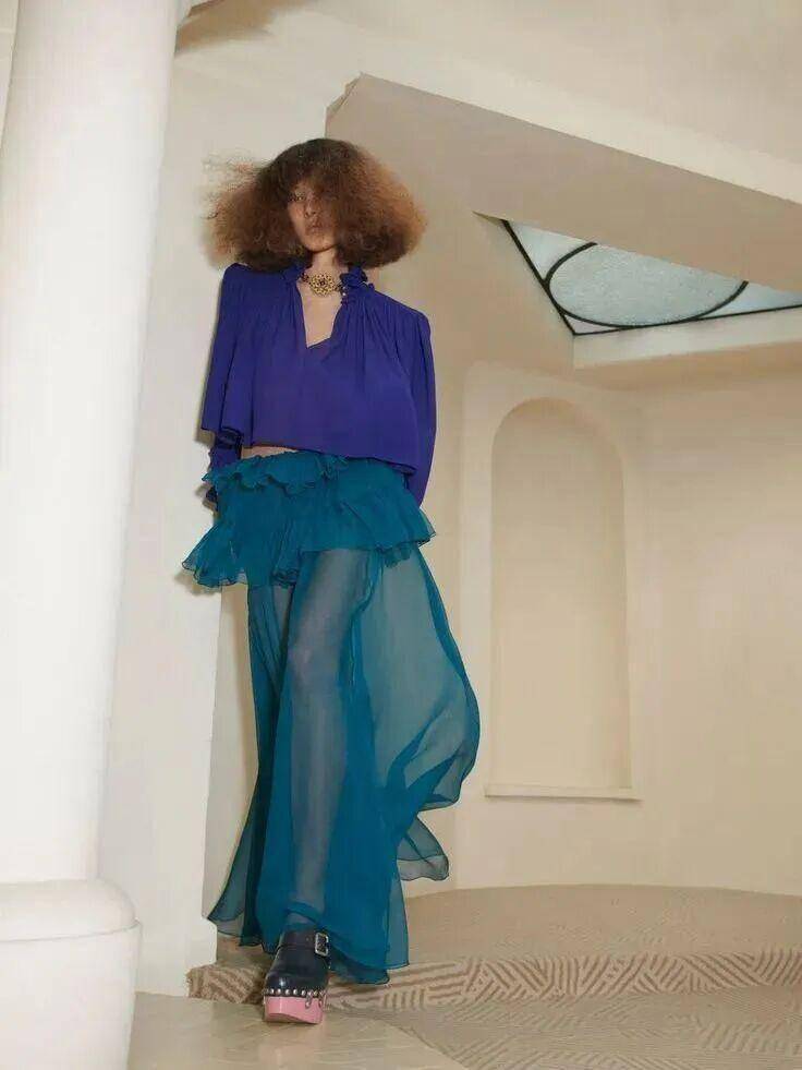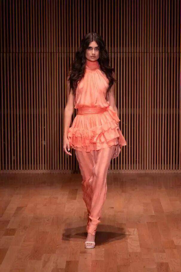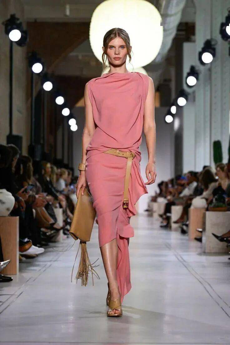 本季设计师用它打造层叠薄纱裙、挺括工装连体裤、顺滑丝绸衬衫,把女性柔美与街头酷感平衡得恰到好处。