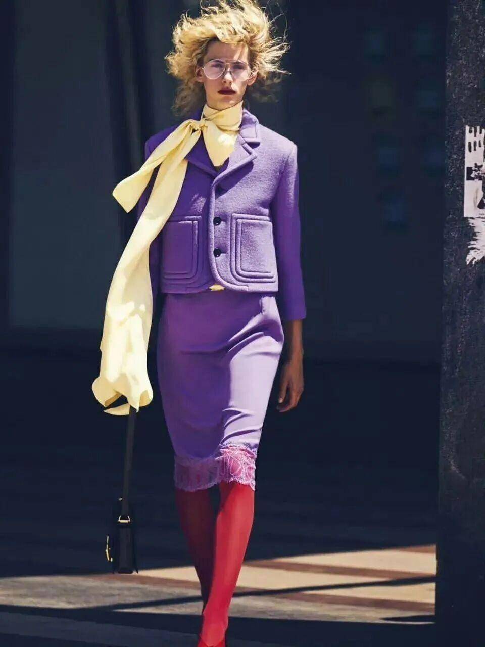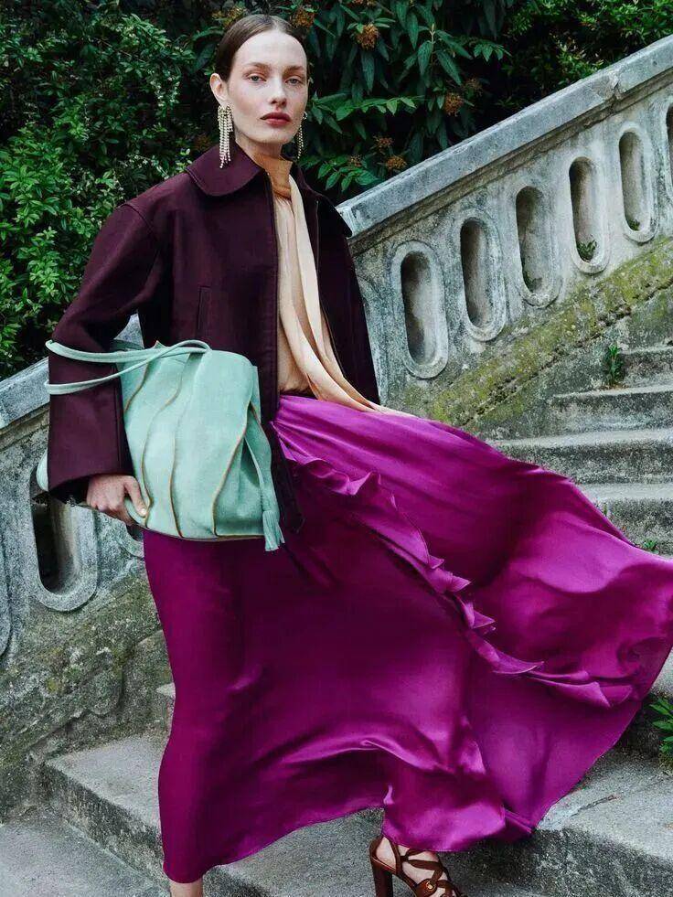 搭配上和中性色是天作之合,紫翠玉半裙搭配同色系衬衫,高级感拉满;小面积用在包包、鞋履、配饰上,也能为黑白基础穿搭增添迷人焦点。