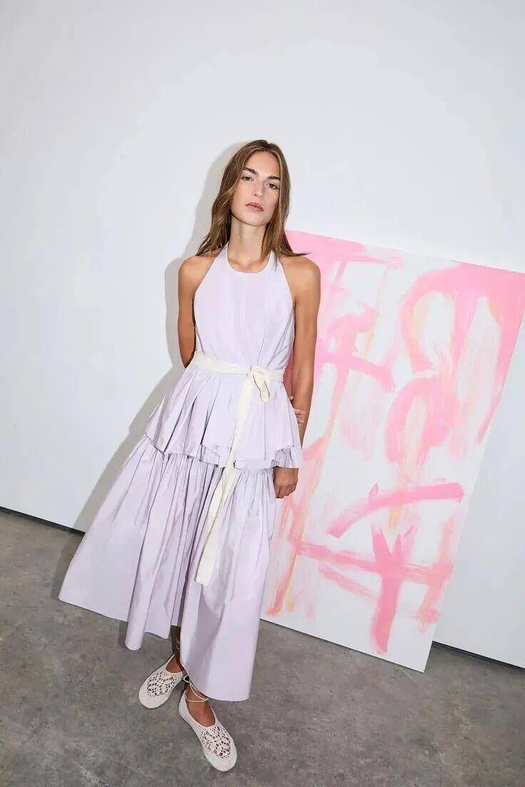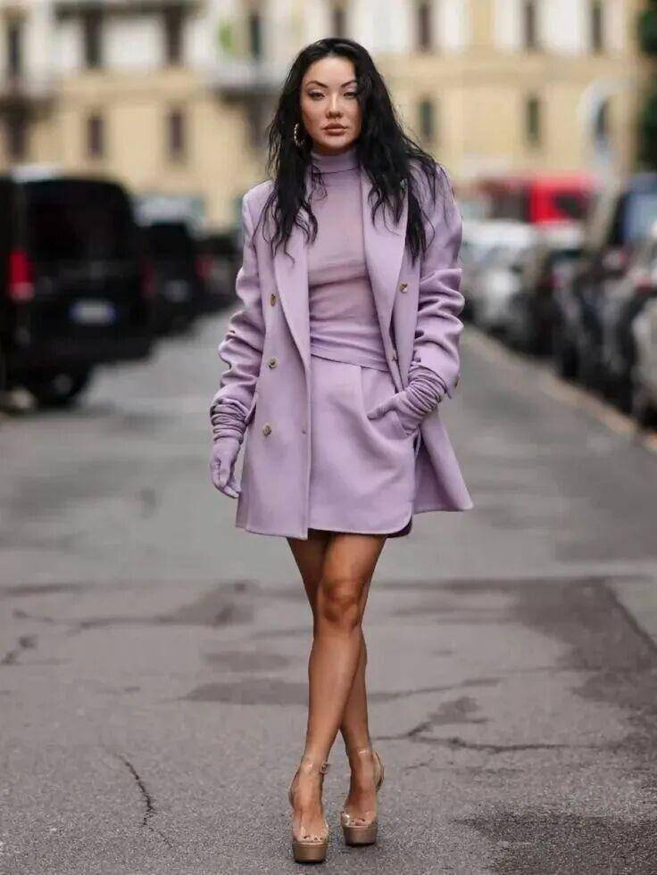 一条紫丁香长裙,清新知性,尽显女性柔美;搭配西装、风衣等硬朗单品,还能中和锐利感,让造型更松弛柔和。