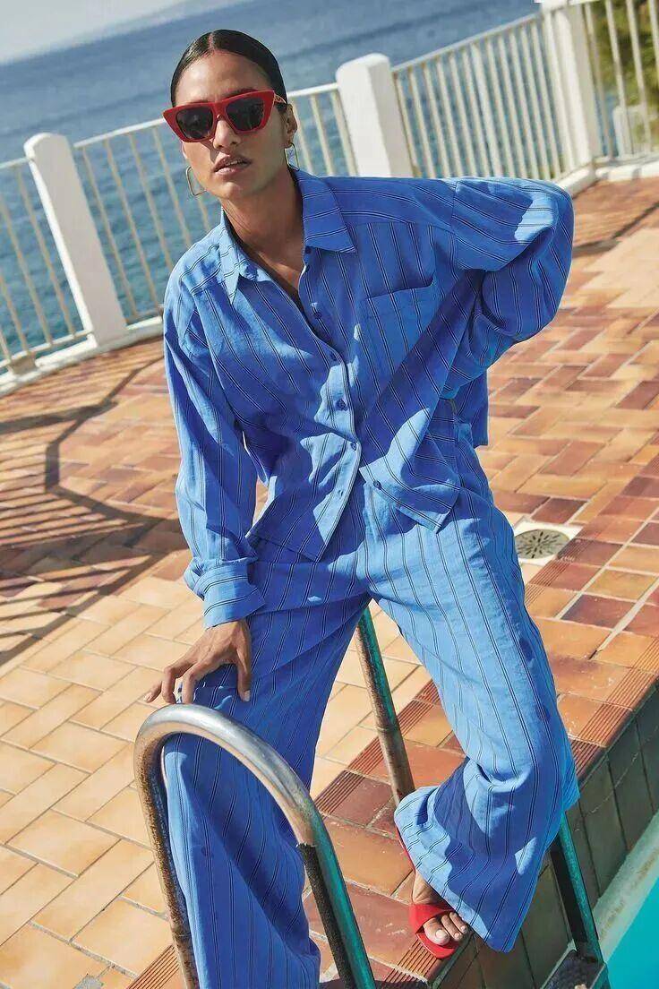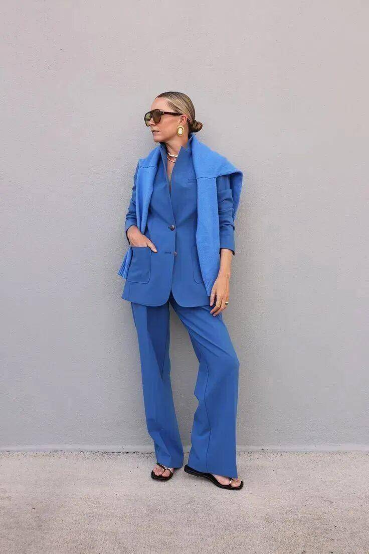 对于亚洲肤色来说,码头蓝堪称友好色天花板。一身同色系码头蓝西装,干练知性,完美适配职场。