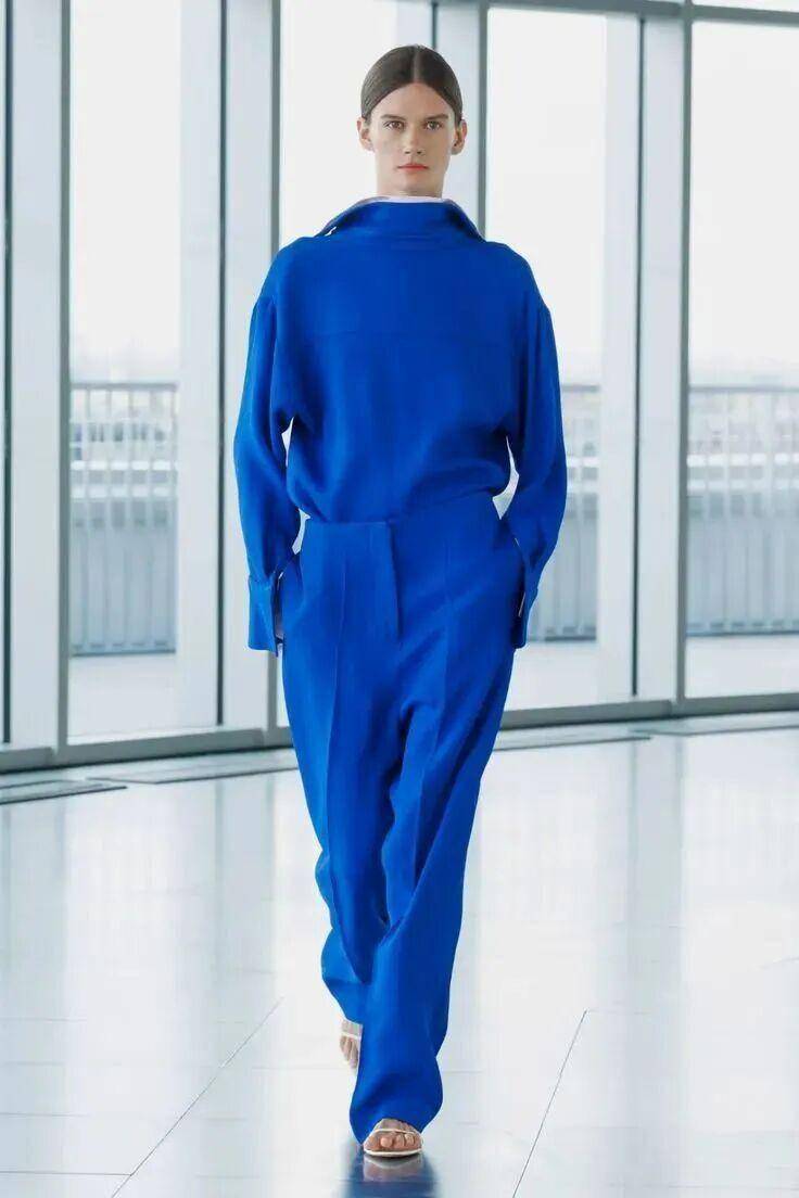 设计师将这抹蓝色融入垂感长袍、利落衬衫、廓形西装之中,打造出从容大气、自带气场的现代女性造型。