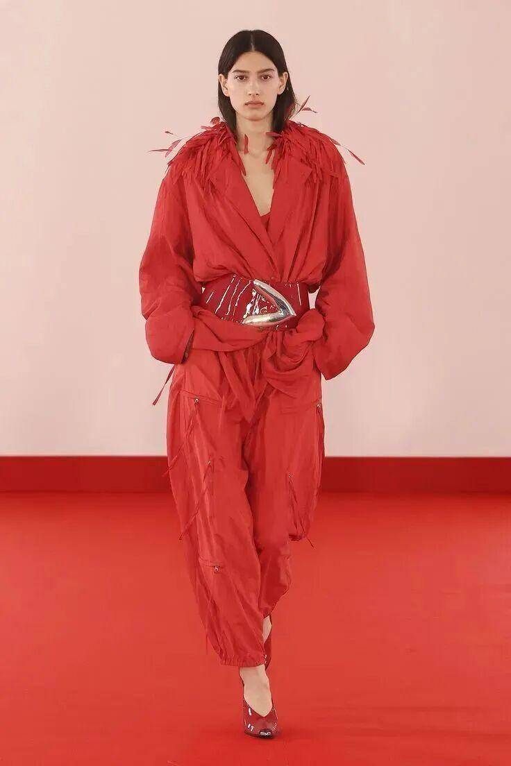 春夏秀场以棉质、丝质面料承载这抹红色,柔软的材质中和了色彩的锐利,让力量感与温柔感完美融合。