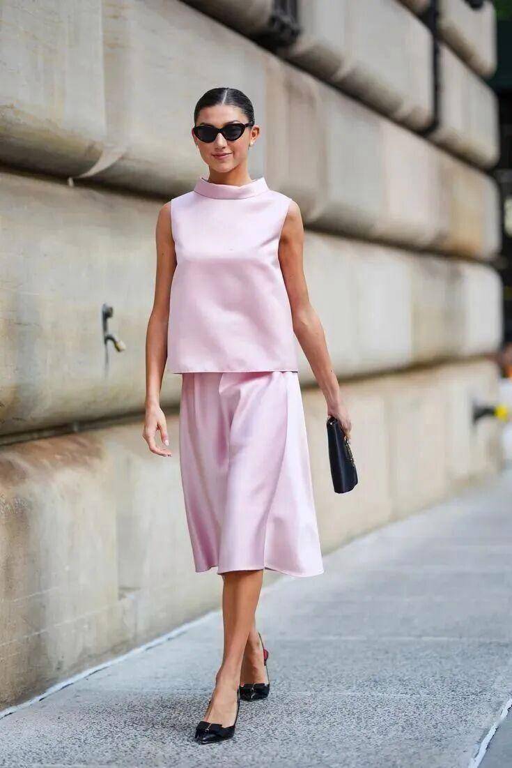 作为造型点睛色再合适不过,一件甜瓜色上衣、一条丝质吊带裙,就能让基础款穿搭告别平庸,自带明媚乐观的生活气息。