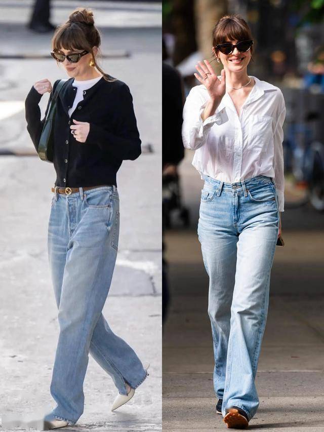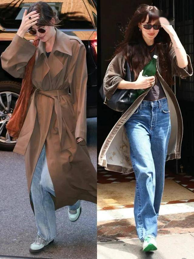 她的衣橱看似简单,却藏着很多值得借鉴的细节。直筒牛仔裤是她的“万能单品”,无论是搭配黑色针织开衫、红色毛衣,还是叠穿在风衣里,都能保持干净利落的轮廓。而她选择的牛仔裤大多是浅蓝或深灰的水洗色,没有破洞或夸张装饰,却能通过版型和搭配,营造出舒服的比例。