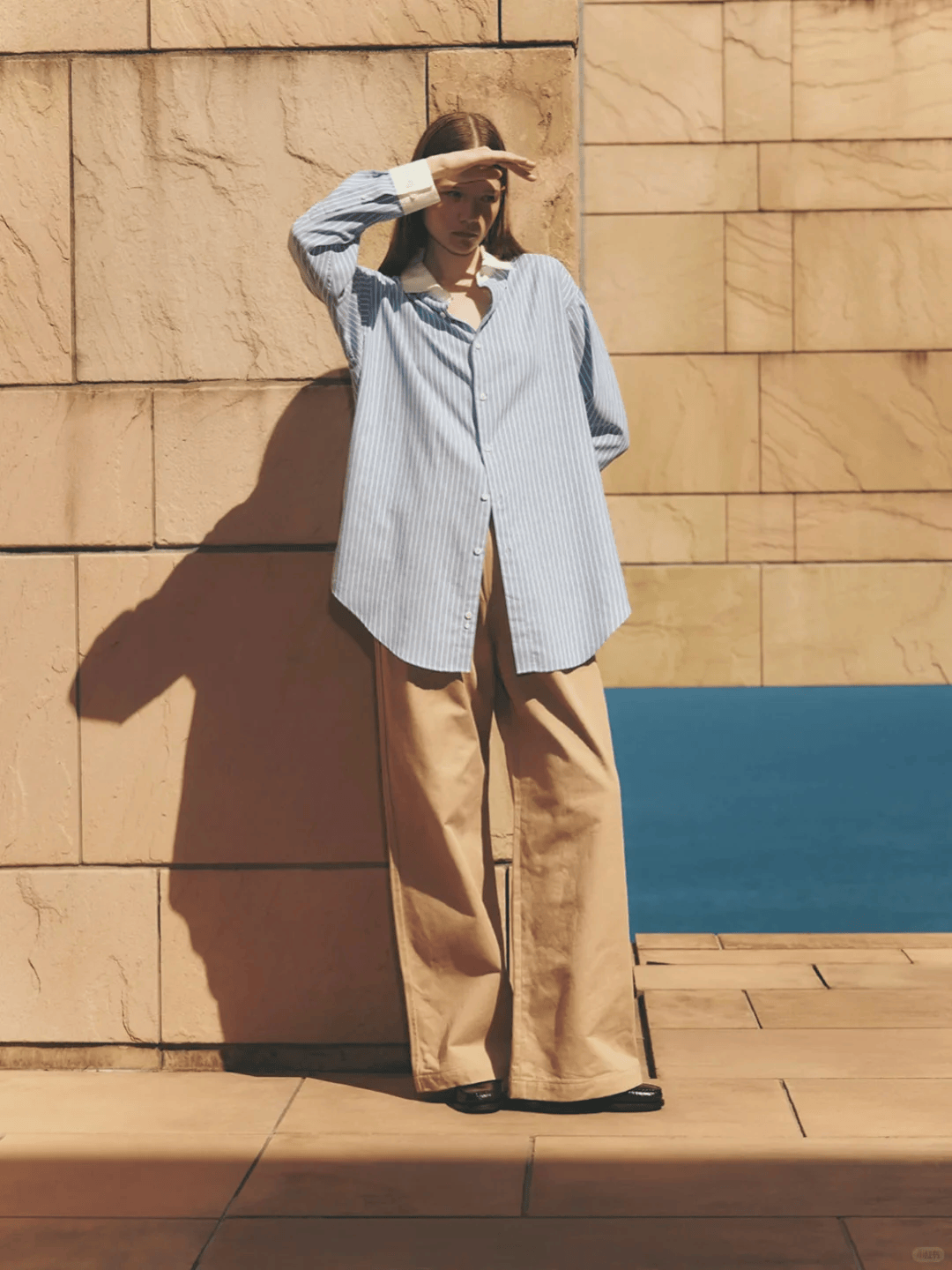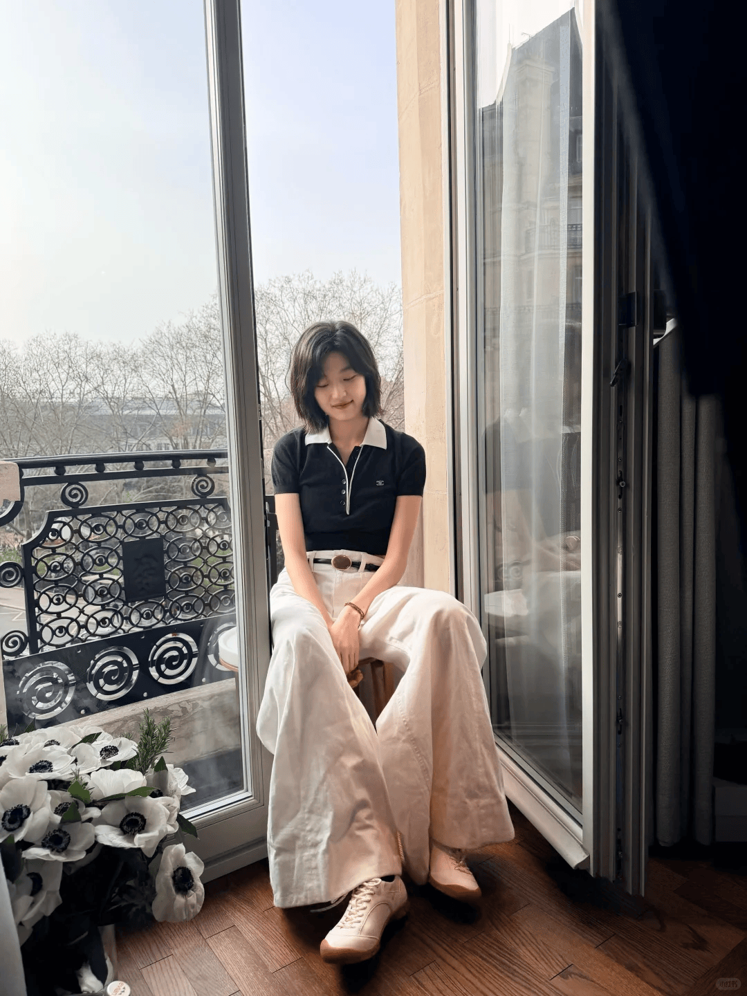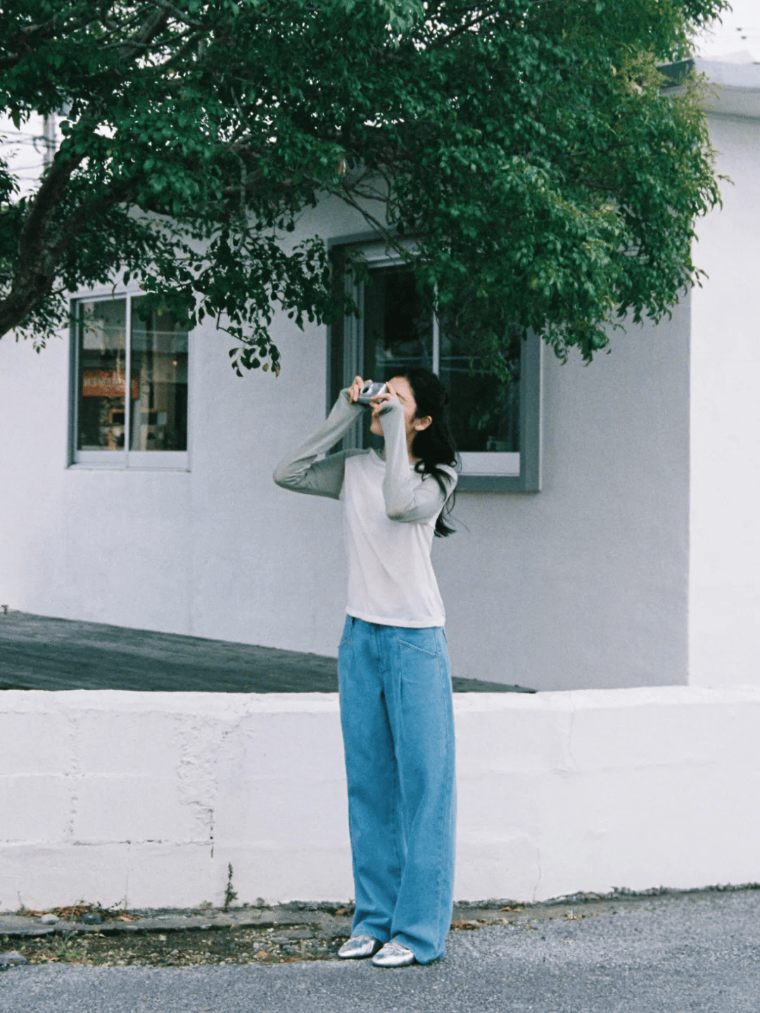 九分阔腿裤露出脚踝,搭配乐福鞋、芭蕾鞋