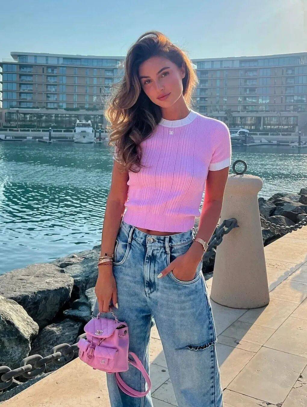 修身针织衫配高腰直筒牛仔裤,