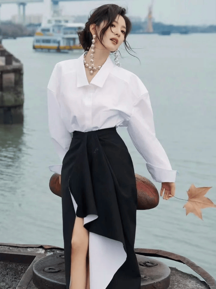 基础款白衬衫配一条有设计感的半裙,