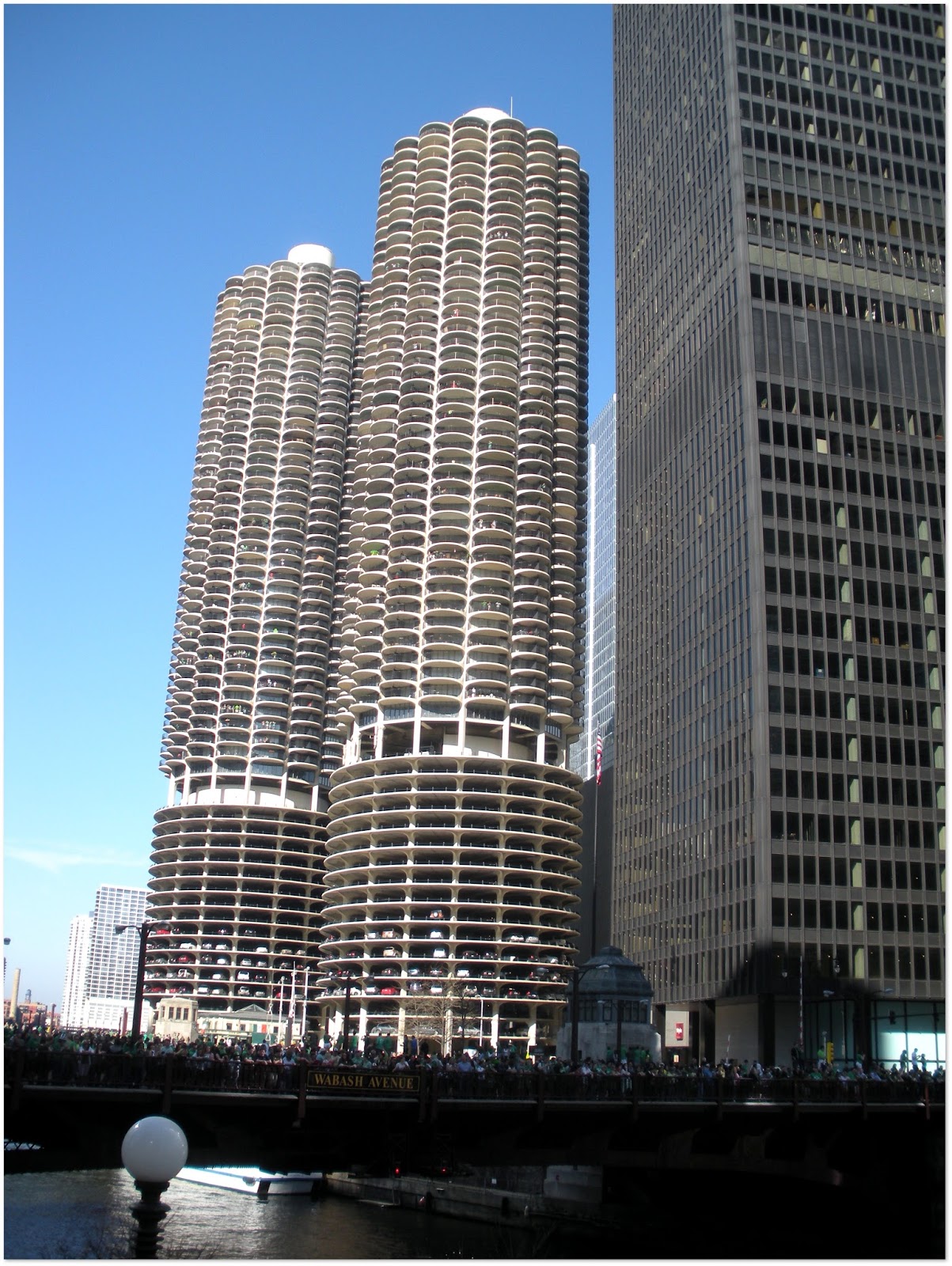 Marina City. Corn shape 65-story twin tower, completed in 1961. It's might not be too exaggerate to call it a city, since it is a mix-used building where you can find condos, hotels, offices, restaurants, bank, restaurant, theater, opera house, and so on... most of the stuff you can expect from a small city. First 19 floors are used as a giant parking lot, looks fancy from far: