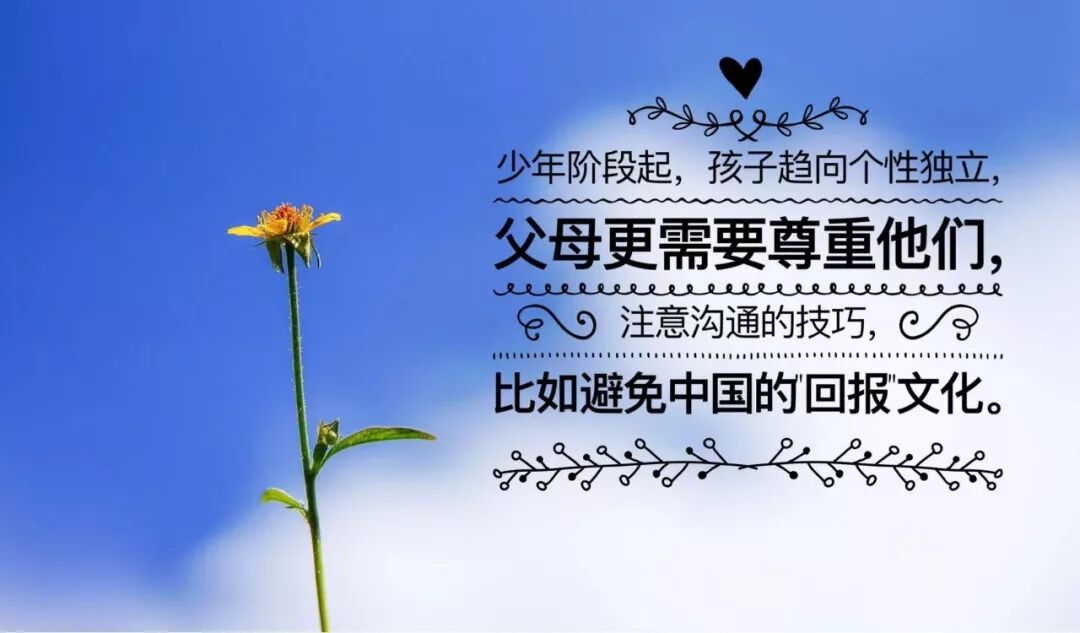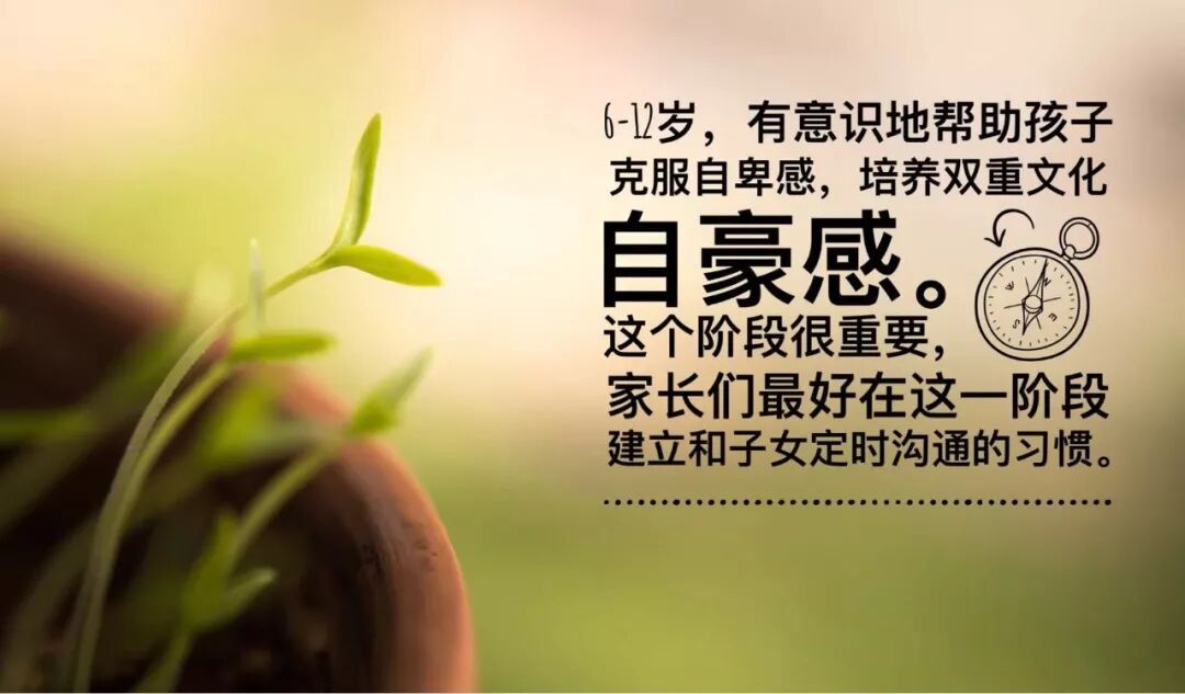 一般来说,孩子在0-6岁期间很"听话"。在这个阶段,父母可以培养孩子对中国文化的热爱,坚持说中文。到了6-12岁,就要有意识地帮助孩子克服自卑感,培养双重文化自豪感。这个阶段很重要,家长们最好在这一阶段建立和子女定时沟通的习惯。从少年阶段起,孩子趋向个性独立,父母更需要尊重他们,注意沟通的技巧。比如接受了美国文化的孩子,不能理解中国的"知耻"文化和"回报"文化。也不能接受说自己一无是处的批评,对自己好了还要更好的要求,和"出类拔萃"的期待。他们或早或晚会感激父母对他们的辛勤付出,但是他们不认为,家长的牺牲是他们必须以优异成绩或者服从,来"回报"父母的理由。在与孩子沟通时要学会耐心和认真的聆听。家长说话的时候,要注意自己的平等语气和诚恳的表情。要特别注意避免拿自己的过去和孩子比较,避免拿孩子和其他孩子比较,避免使用偏见和极端的语言。最好用陈述事实的语句,越具体越好,而不是用判断的语句和孩子交流。特别是在需要批评他们的时候。建议家长可以使用"三明治" 技巧,即先表扬,再批评,最后给予鼓励,这样就把批评内容夹在中间,避免造成正面冲突。另外,可以改批评孩子为表述自己的感受,多用 "我语",少用 "你语"。比如,把"你就是贪玩,不好好学习",改为说 "我对你最近很晚才回家,又不写作业非常担心和着急。"
