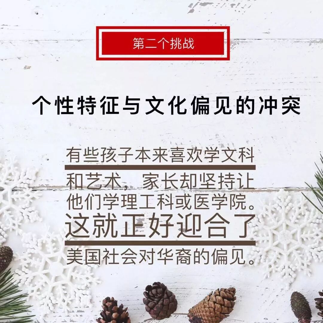第二个挑战是个性特征与文化偏见的冲突。有些华裔孩子本来喜欢学文科和艺术,家长却坚持让他们学计算机,学医,去商学院或其他理工科。这就正好迎合了美国社会对华裔的偏见。认为他们只会数理化,他们更关心的是自己的就业和收入,而不是社会问题和人文思想。所以认为他们缺少管理和沟通的能力。