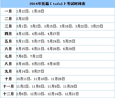 同时给出了全年的托福考试时间表。2014年中国托福考试共38次,具体时间见下表: