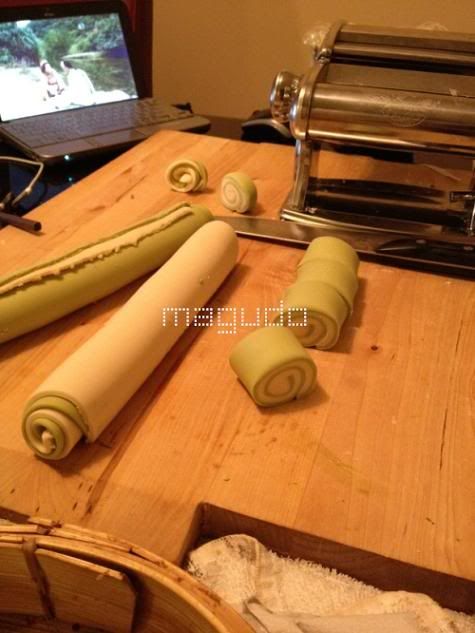 ↓当然和面包机,搅拌机不能比,和面还是挺累的,不过可以擀出平整的面片,然后两种颜色的面片叠起来,一卷,就可以做出卷卷的双色馒头~