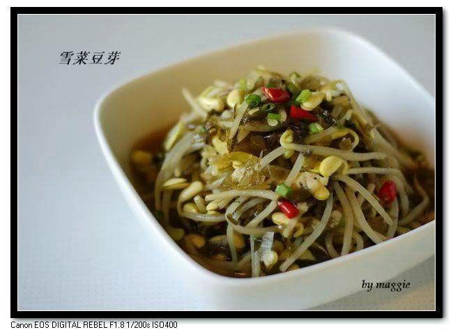 2.先放入雪菜翻炒,再放豆芽。加水略煮几分钟,待豆芽入味,加盐和鸡精调味即可。