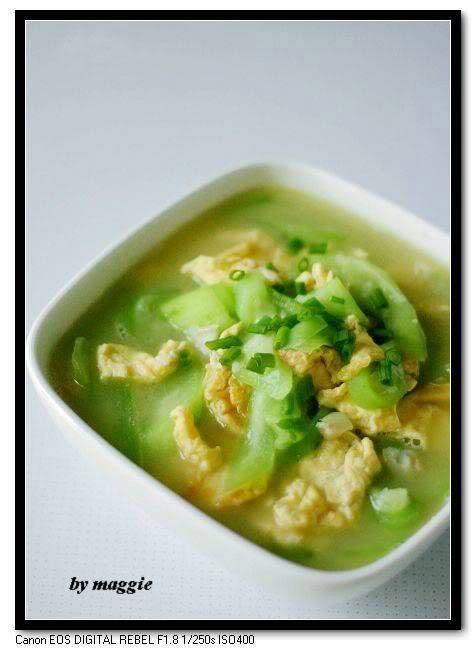 丝瓜用油和蒜末略煸炒一会儿,加高汤(水也可以),沸了之后加入炒好的鸡蛋,略煮片刻,加盐调味即可。出锅前葱花点缀。