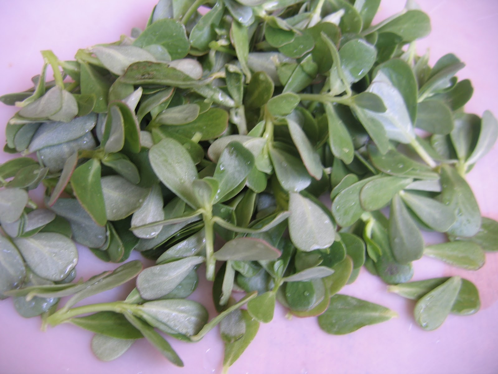 Nip tender portions of the purslane with the stem (top 1 inch) and pick the leaves on the bottom portion without the stems. Wash thoroughly and drain in a colander.
