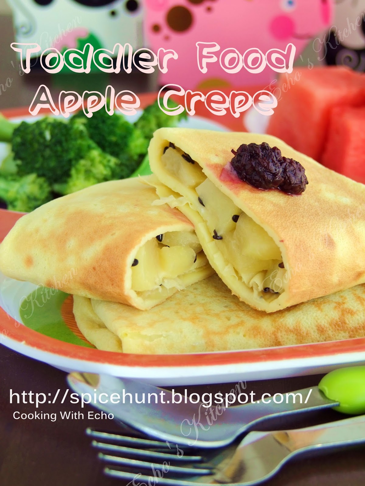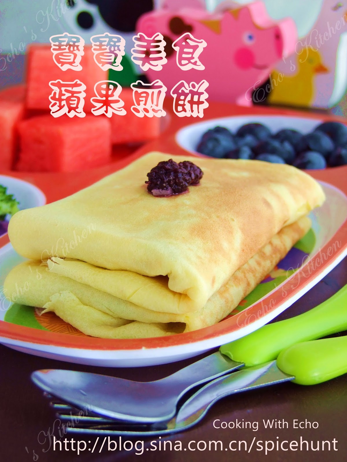 4. 煎一分钟,煎饼成型之后,在煎饼下半部放上2 tbsp的苹果丁。然后把面饼折起包起成一个盒子状。