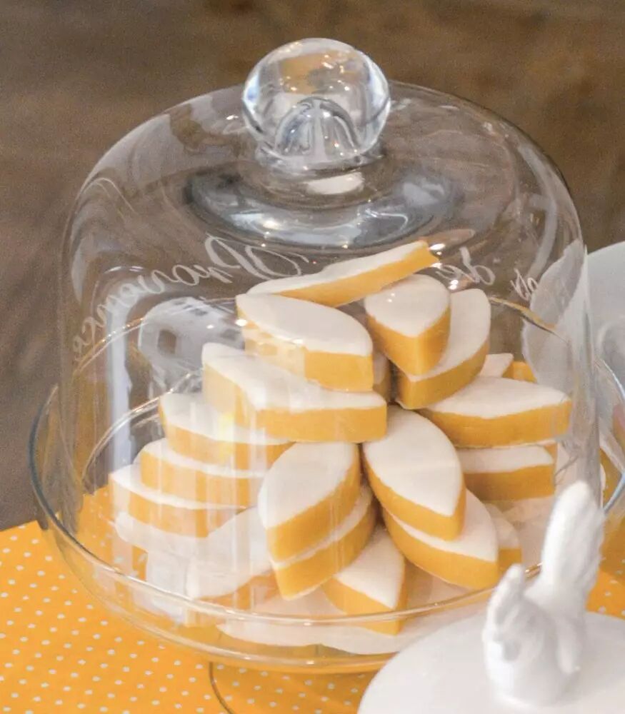 在中国,荔枝素来有着妃子笑的美名。满载新鲜荔枝的马车一日千里北上京师,只为博得杨贵妃会心一笑。而在法国,妃子笑这个颇具意味的爱称非艾克斯卡里颂杏仁饼莫属。传说十五世纪那不勒斯国王兼普罗旺斯伯爵勒内德安茹(Ren dAnjou)娶了性格乖戾的让娜德拉瓦尔(Jeanne de Laval) 为妻,婚礼上宫廷甜点师欲讨这位冰山美人的欢心,将蜜饯和杏仁捣碎搅拌在一起,制成软糯丝滑的糖糕,再在上面铺上一层松脆的蛋白糖霜,便创造出了一道不同口感交织在一起的独特甜点。让娜尝过之后,瞬间绽放出了久违的笑容。一个朝臣见状,惊讶地问道:是什么让王后如此高兴?旁人回答道:是爱抚。(奥克语:Di Calin soun.)从此这道金灿灿的宫廷上品便有了卡里颂(奥克语:Calissoun)这个充满爱意的名字。当时的那不勒斯臣民若是看到一骑红尘妃子笑的景象,想必不用猜就知道那准是王后爱吃的卡里颂杏仁饼来了!