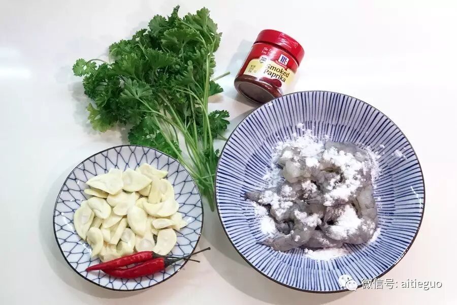 ▲ 虾剥壳开背去肠线,用生粉/太白粉抓揉再水洗沥干,用少许盐和白酒腌10分钟,用厨房纸沥干;大蒜切片,香料和辣椒切碎