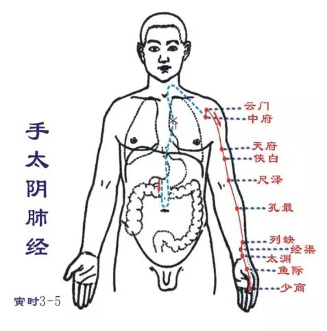 从肩胛骨凹陷处连出一条直线,沿着手臂内侧,到拇指内侧端止,为人体肺经。
