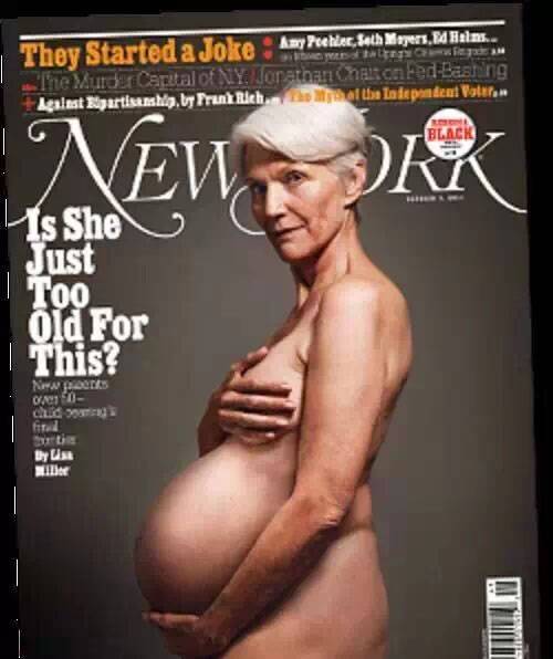 梅耶近几年最出名的一次是上纽约周刊的一期封面,63岁的她全裸,大着肚子9个月怀孕(当然是PS的啦)的样子。标题是:她做这个会不会太老了呢?
