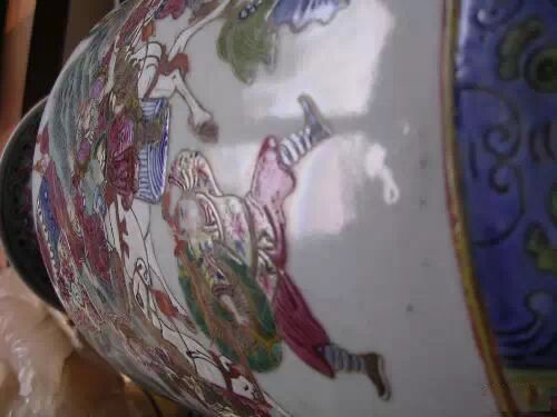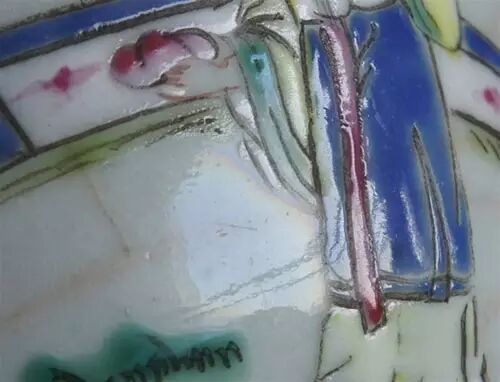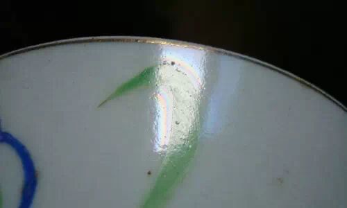 彩瓷真品“蛤蜊光”的特征是:器物画面的彩料周围有闪亮变幻的“蛤蜊光”,尤以蓝彩的周围为甚。赝品彩瓷“蛤蜊光”的漏洞是:器物画面的彩料上有闪亮造假的“蛤蜊光”,彩料周围没有一丝真品上的“蛤蜊光”。原因不必多说了,赝品的胎质不对,釉色不对,纹饰不对,“蛤蜊光”自然也不对,赝品彩瓷没有真品的“瓷龄”,不可能会有彩瓷真品上自然形成的“蛤蜊光”。