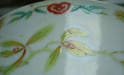 彩瓷多少年才会出现“蛤蜊光”?这只能靠藏家的实践来验证,不可能有一个准确的年代来限定。原因很简单,因为同是同治时期的粉彩器物,有的器物就出现了“蛤蜊光”,有的器物就没出现“蛤蜊光”。无论是官窑或民窑的彩瓷每件的境遇都有所不同,就是同一时期的彩瓷出现“蛤蜊光”也会有早有晚。