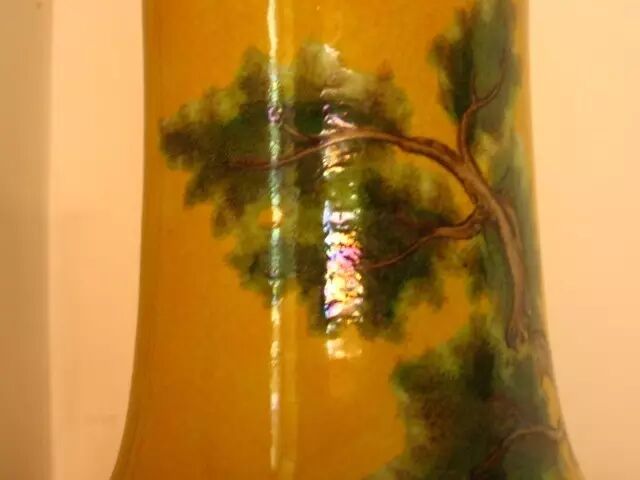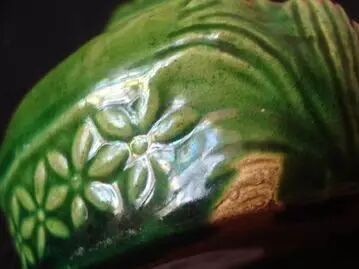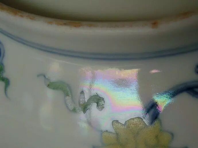到了清初,黄、绿、蓝等釉色以及此类釉色的边缘部分,也常常可以看见这种正视难看见,侧视则分明的“蛤蜊光”。这种特有的迎光显现,避光消退的光怪陆离的光晕,成了古瓷的特征,因此也成了鉴定古瓷的重要依据之一。有一位著名陶瓷专家、鉴定家曾为此写有专著。认为这是由于釉色中一些金属元素,历经近300年左右的岁月,渐渐游离到了瓷面上,因此而形成了“蛤蜊光”。由此断言:清康熙、雍正朝以上年纪的瓷器彩色釉面,才有可能出现这种“蛤蜊光”。