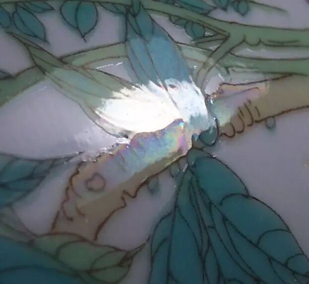 含铅的釉上彩瓷、低温铅釉瓷,受外界物理、化学物质的侵蚀以及本身发生的变化,会在瓷器表面产生一种膜状物。日复一日,随着“瓷龄”增加,这种膜状物也会慢慢地增加、增厚,达到一定厚度时,就会产生类似蛤蜊壳里面那种闪烁的“光”,故人们称它为“蛤蜊光”。再增厚到一定程度,还会出现“银色釉”,但“银色釉”遇水即会褪色。据我们从祖传的数十件官窑釉上彩瓷器中得出:大致要150年的“瓷龄”,才会出现“蛤蜊光”现象。