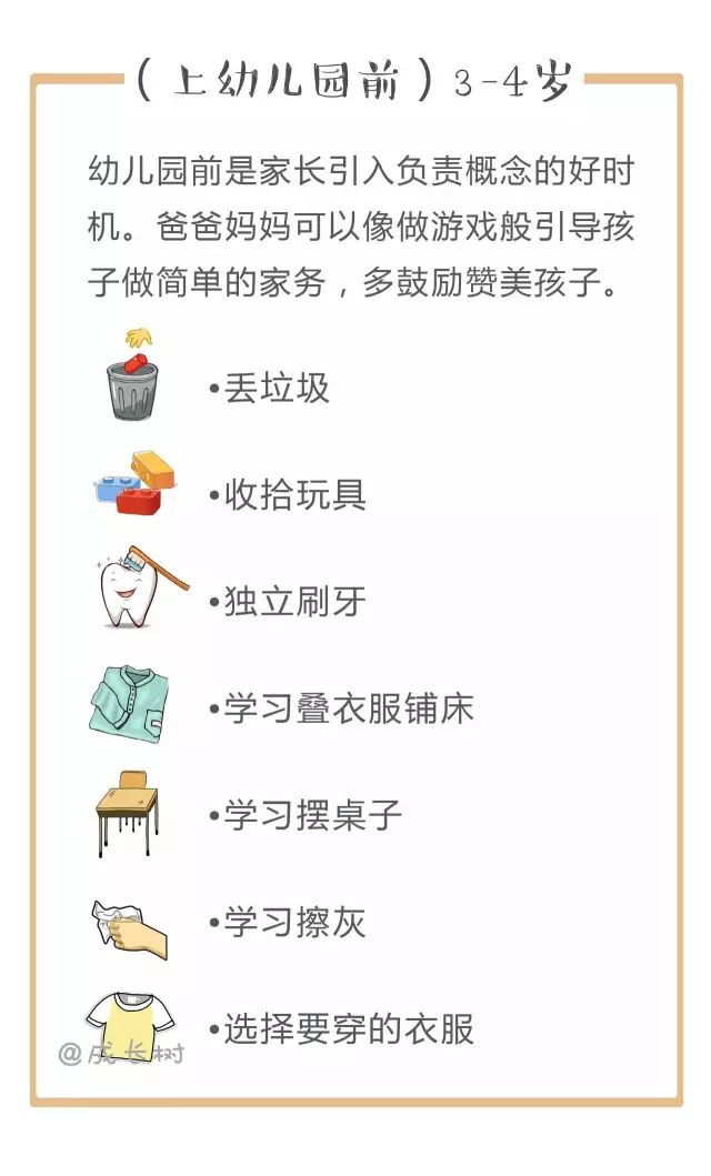 其实从孩子3岁开始,妈妈们就可以有意识地培养孩子做家务了。对照下面的家务年龄表,妈妈们可以更好地把握什么年龄的孩子该做哪些家务↓↓